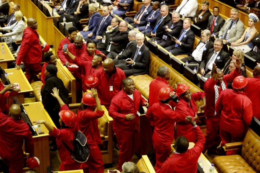 Por uma hora, os deputados do EFF interromperam o discurso, ignorando também os pedidos de ordem e a intimação e Mbete para que deixassem o local.