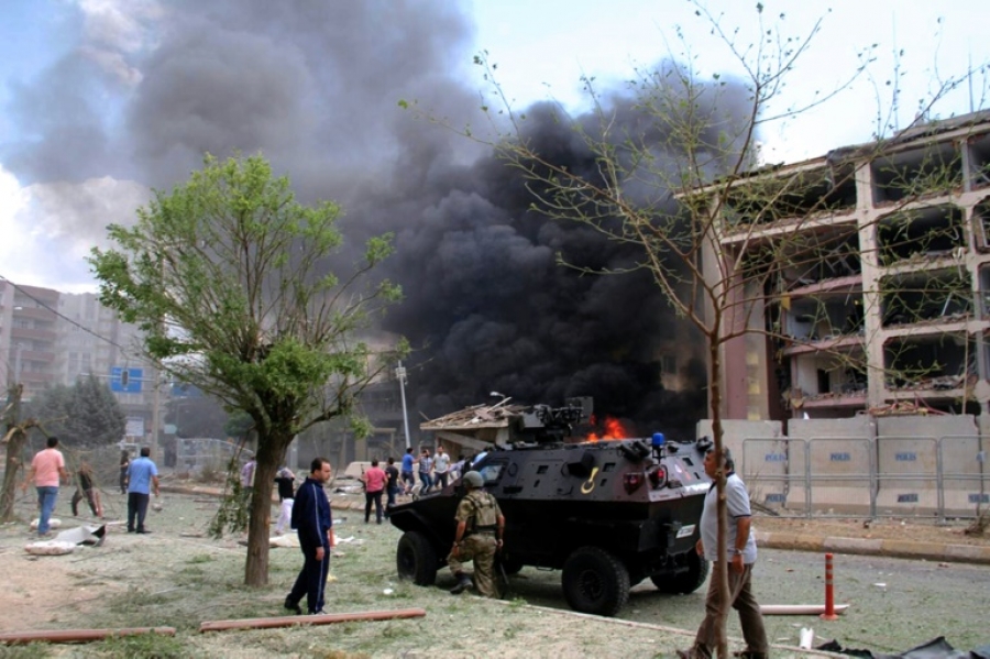 A explosão do carro-bomba em frente ao QG de segurança de Midyat, na província de Mardin, fronteiriça com a Síria, destruiu a fachada do prédio da polícia, com vários andares.