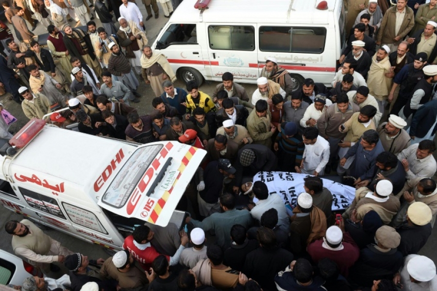 Vítimas do atentado suicída contra a entrada da Autoridade Nacional de Dados e Registros (Nadra) são levadas para um hospital de Mardan, Paquistão, em 29 de dezembro de 2015