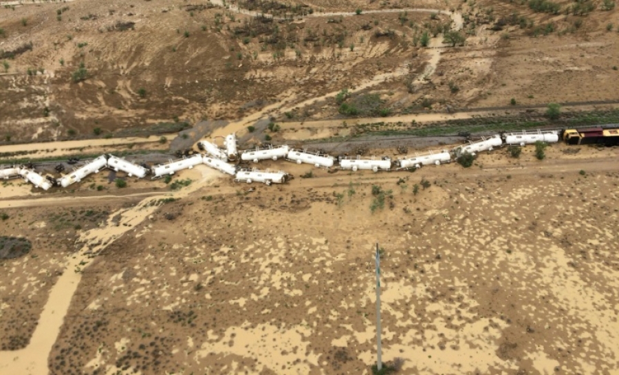 Espetaculares imagens aéreas mostram dezenas de vagões tombados e um deles pode ter sofrido uma fissura, por onde vazou o ácido sulfúrico, muito corrosivo e que pode causar queimaduras graves.