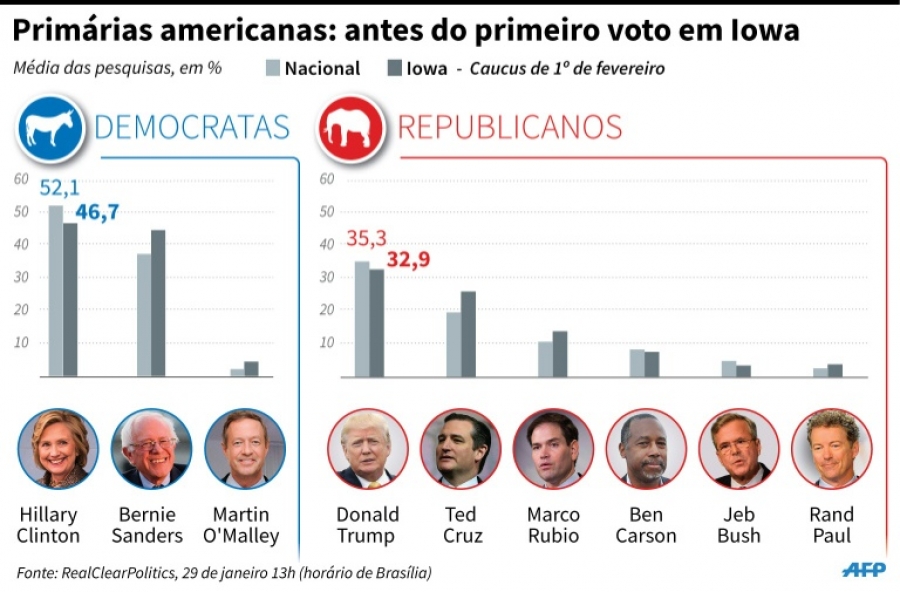 EUA: pesquisas antes do caucus em Iowa, primeira etapa das primárias. EUA: pesquisas antes do caucus em Iowa, primeira etapa das primárias.