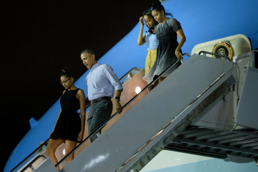 Obama desembarcou do avião Air Force One sorridente, sob uma chuva fina. A primeira-dama, Michelle Obama, e as filhas - Malia e Sasha - o acompanharam quando ele deixou a pista da base Pearl Harbor-Hickam, em Honolulu.